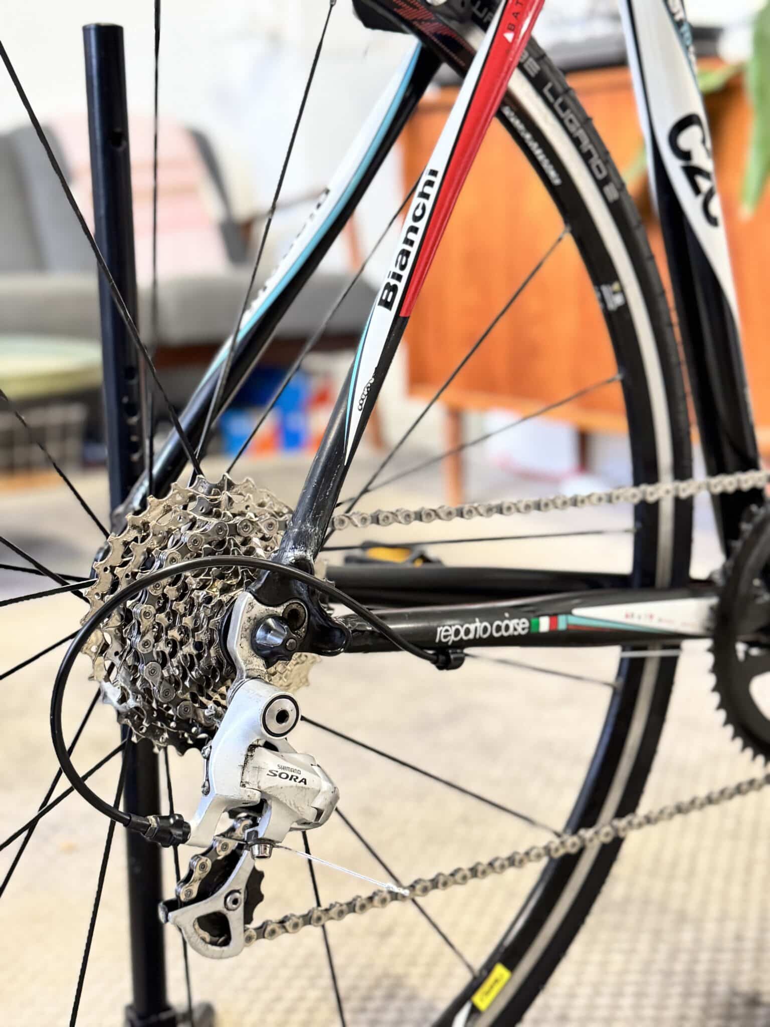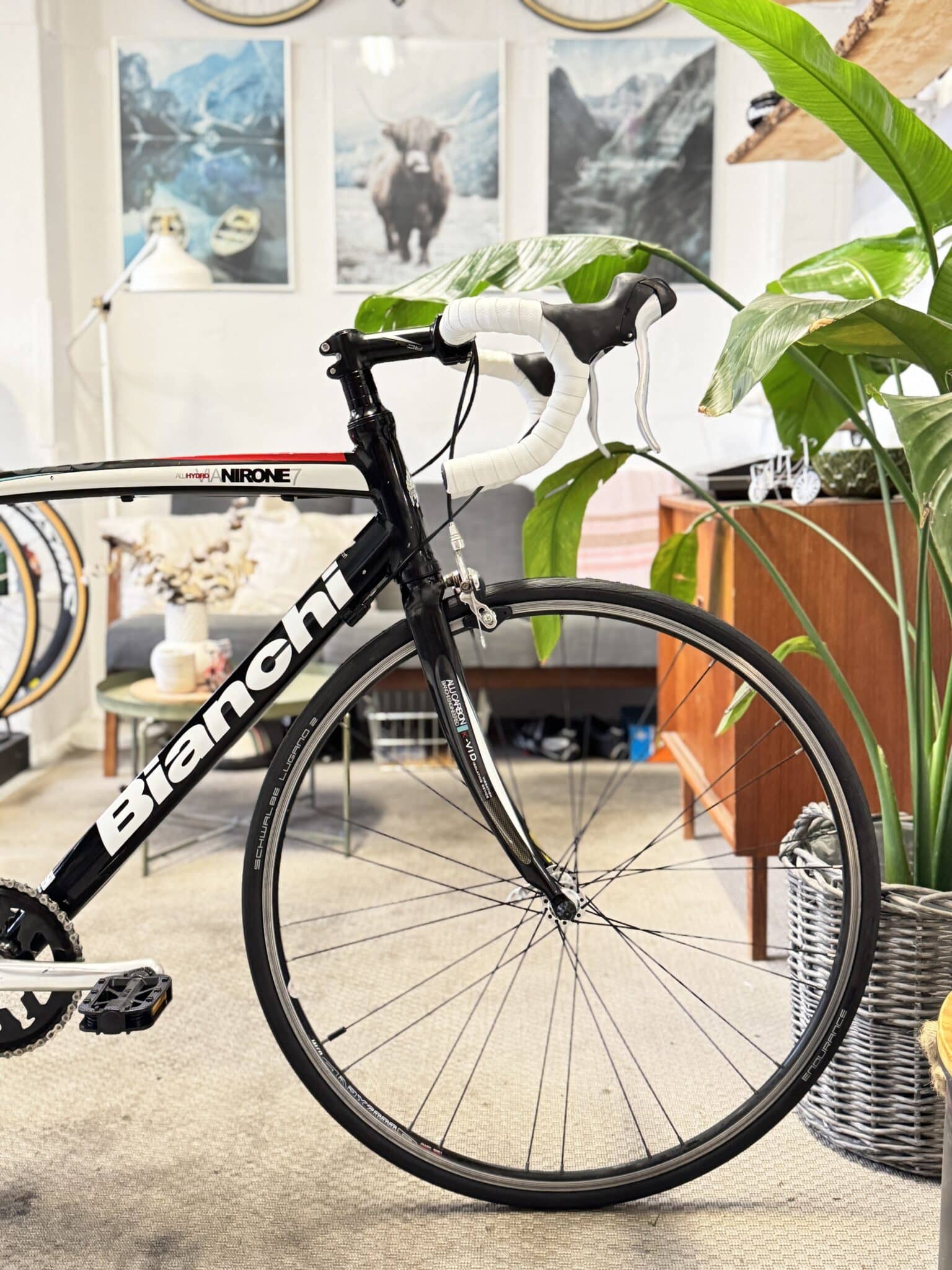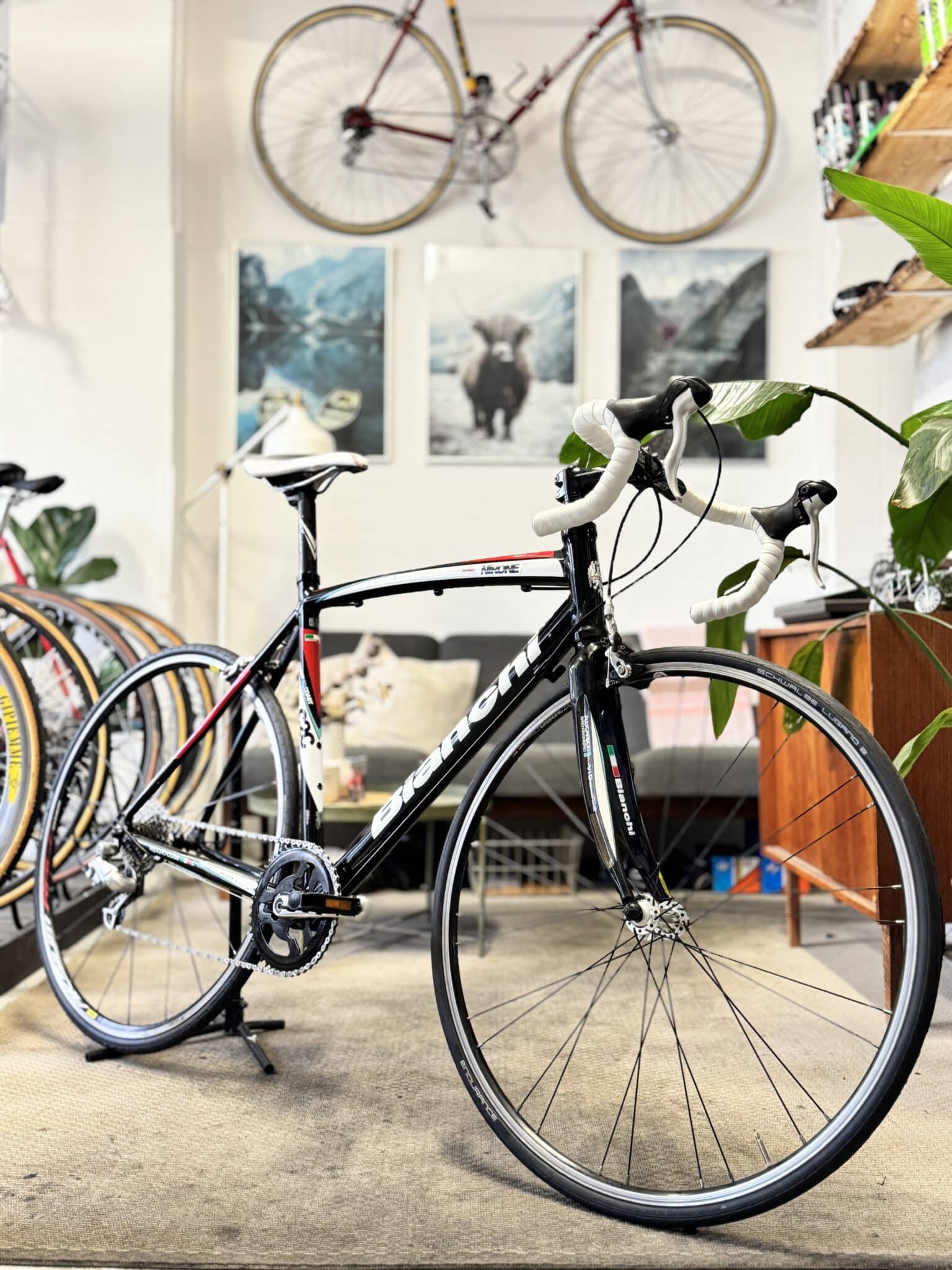 Fantastisk lækker racercykel fra ikoniske italienske Bianchi – let aluminium, klassisk attitude og et look, der bare rammer plet.