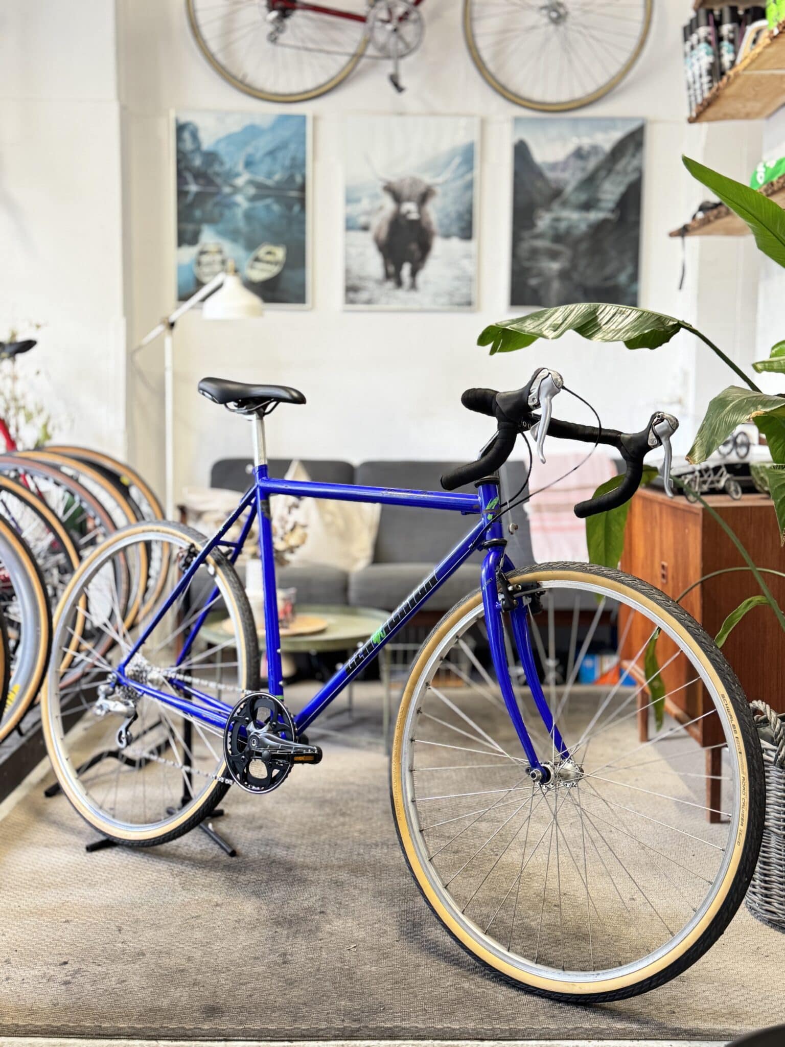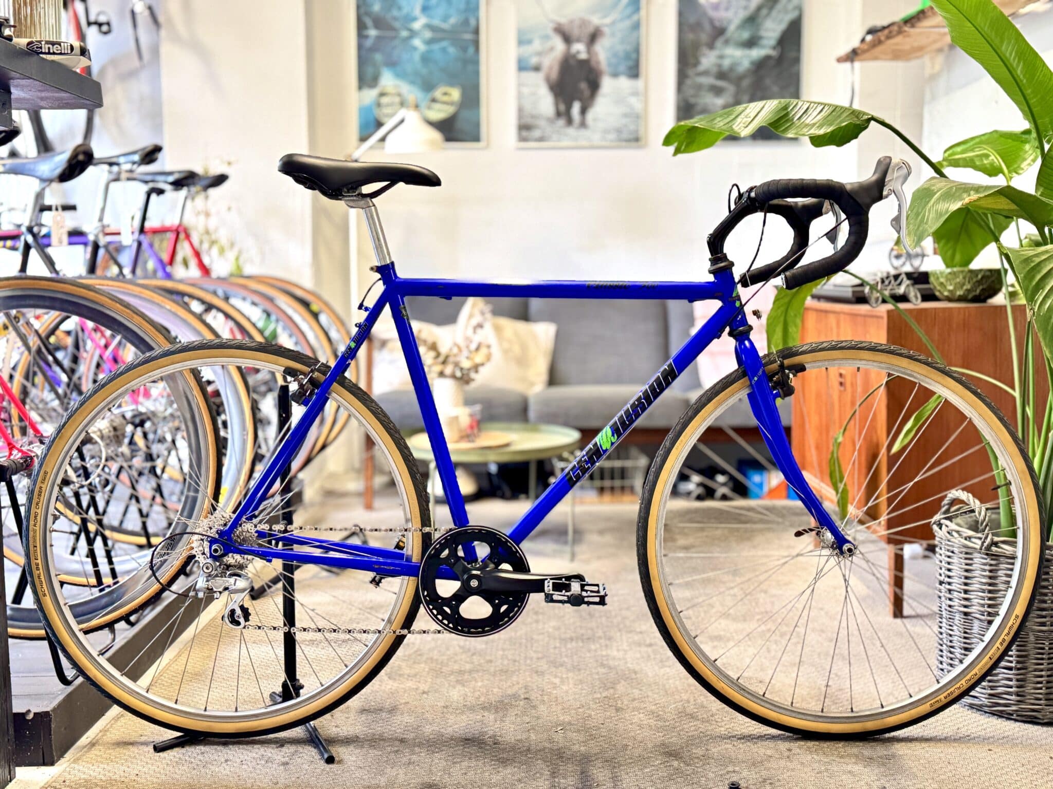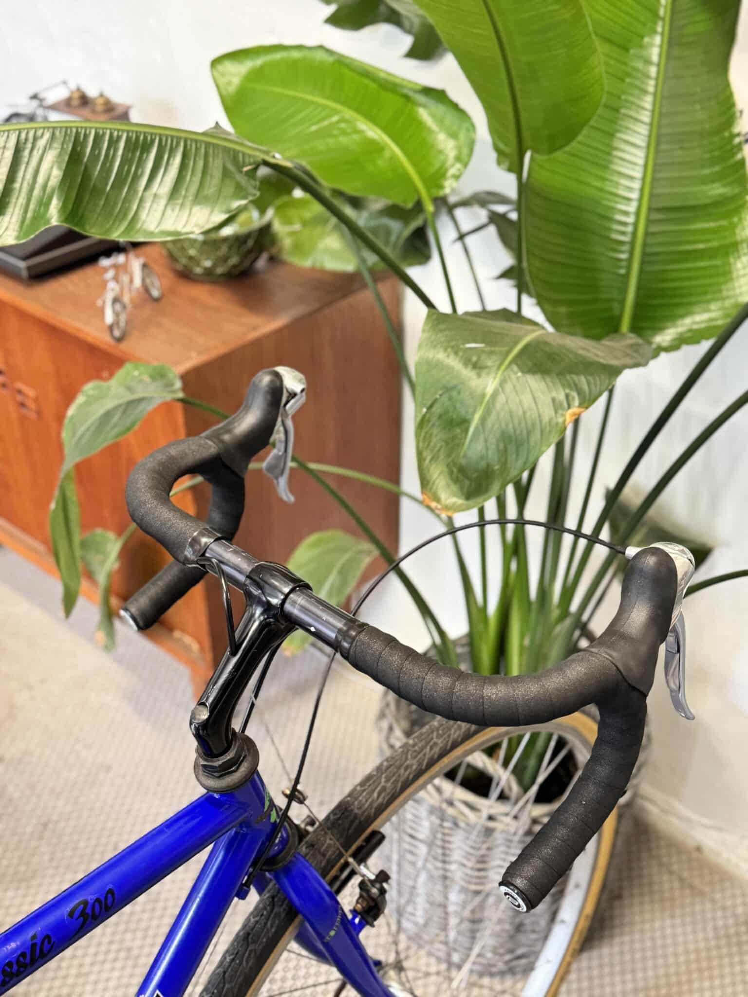 Cyklen står i den klassiske Centurion-blå, med brede 37 mm Schwalbe-dæk med lyse sider og en Shimano 7-speed geargruppe, der sikrer et pålideligt og solidt setup.