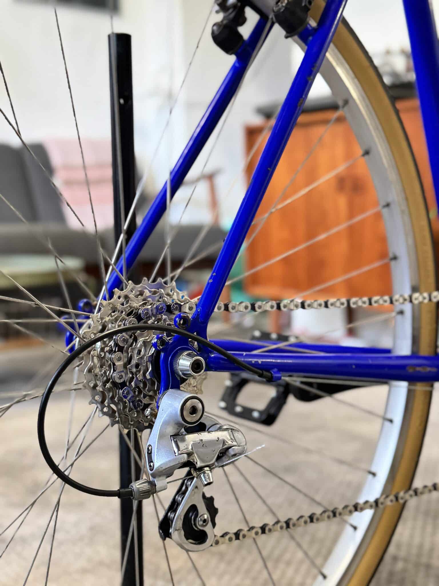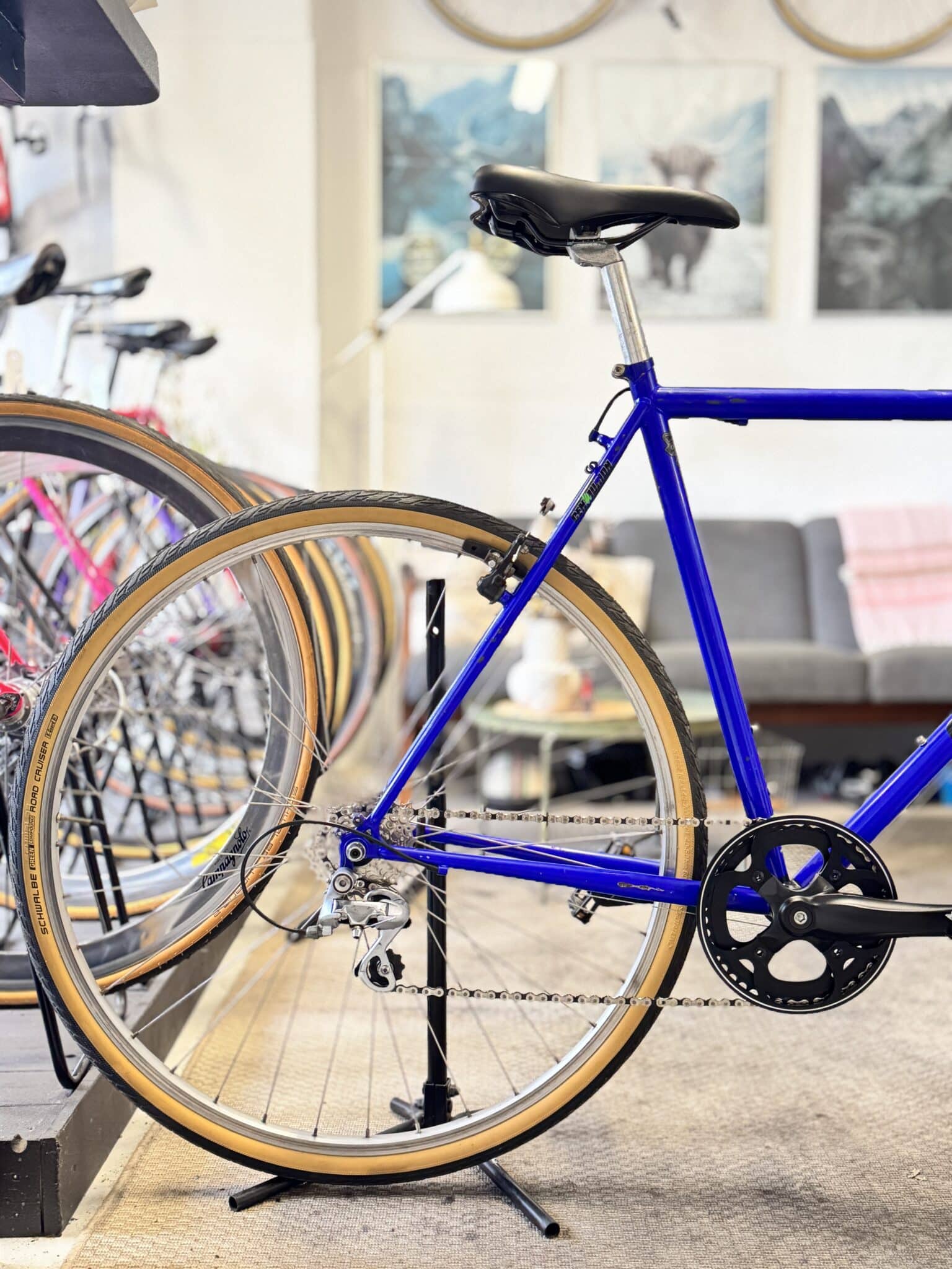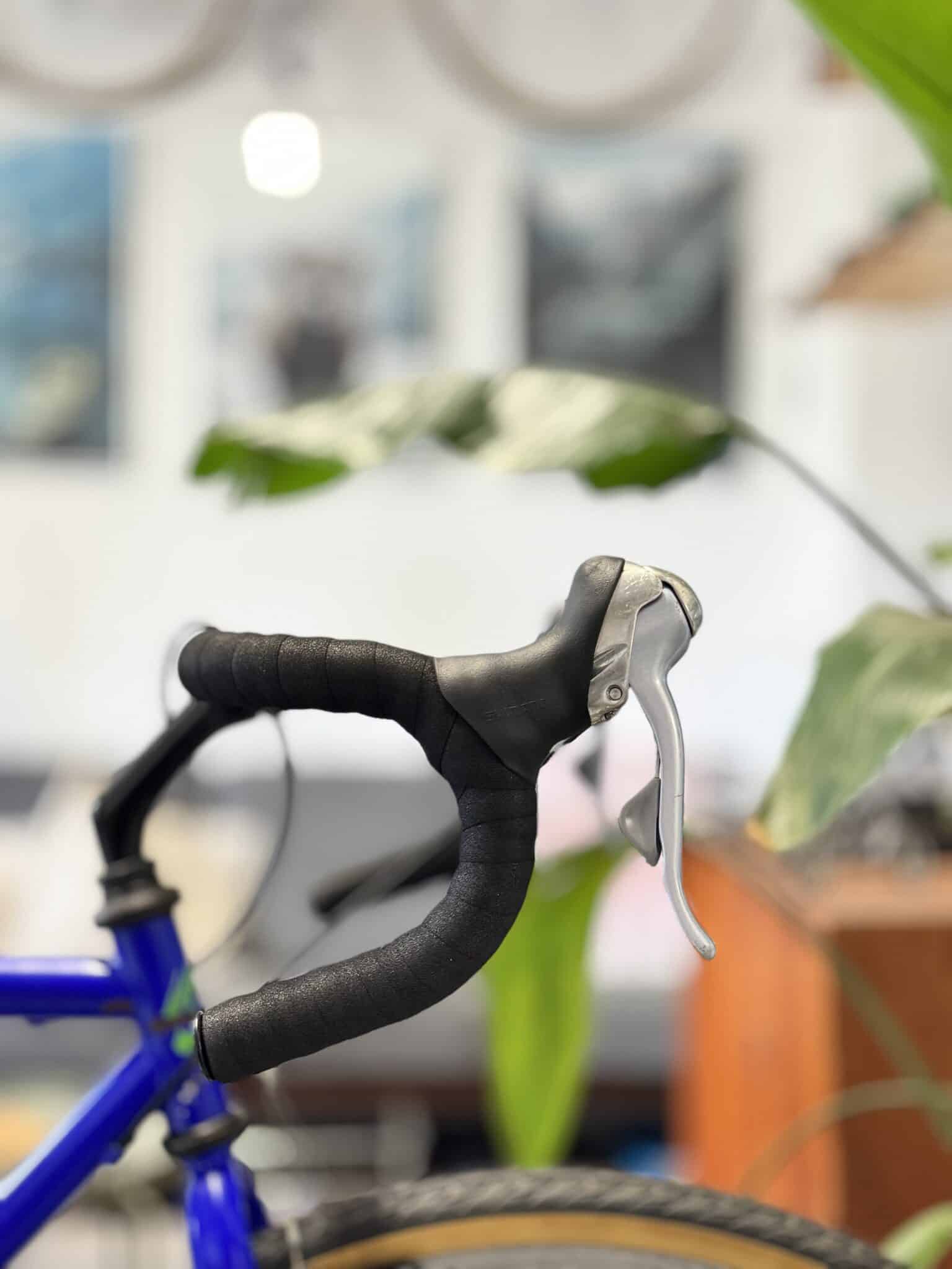 Cyklen står i den klassiske Centurion-blå, med brede 37 mm Schwalbe-dæk med lyse sider og en Shimano 7-speed geargruppe, der sikrer et pålideligt og solidt setup.