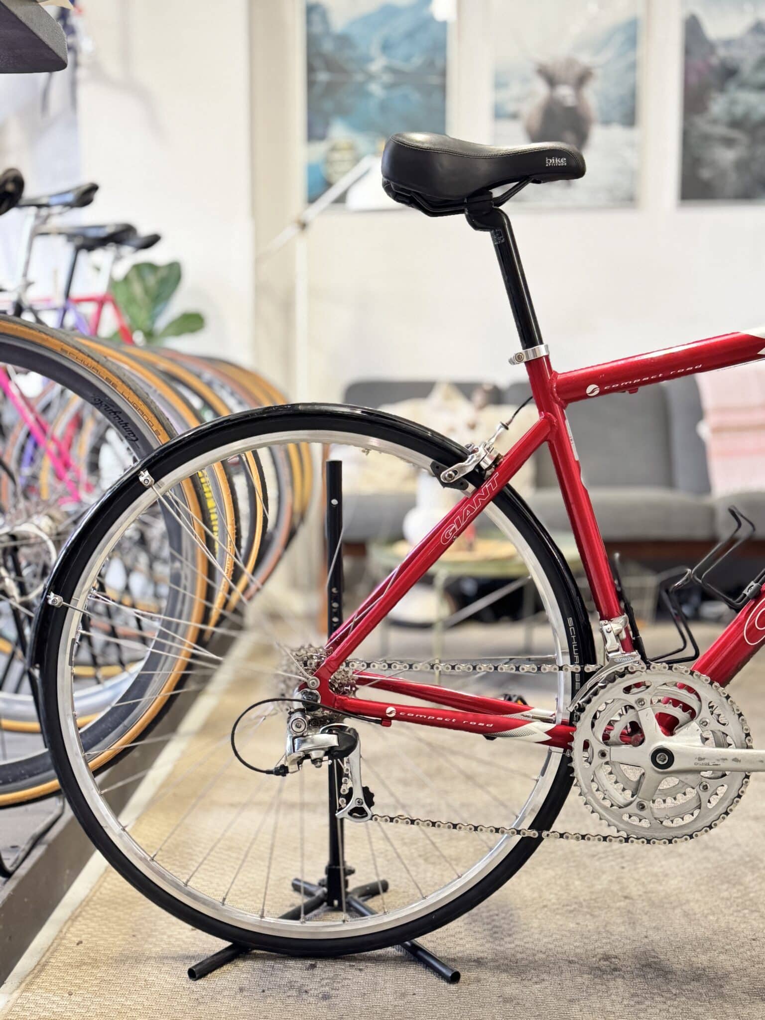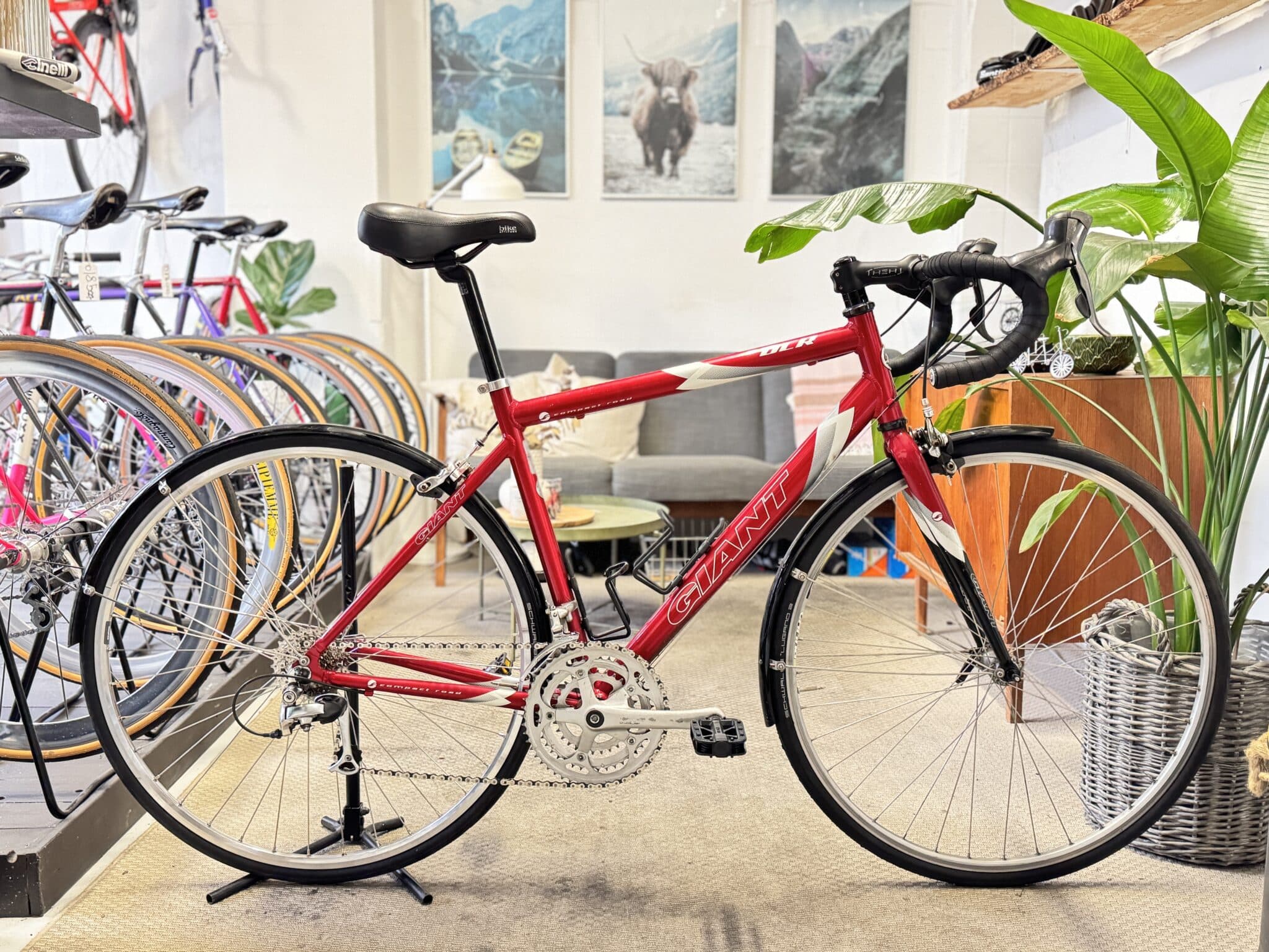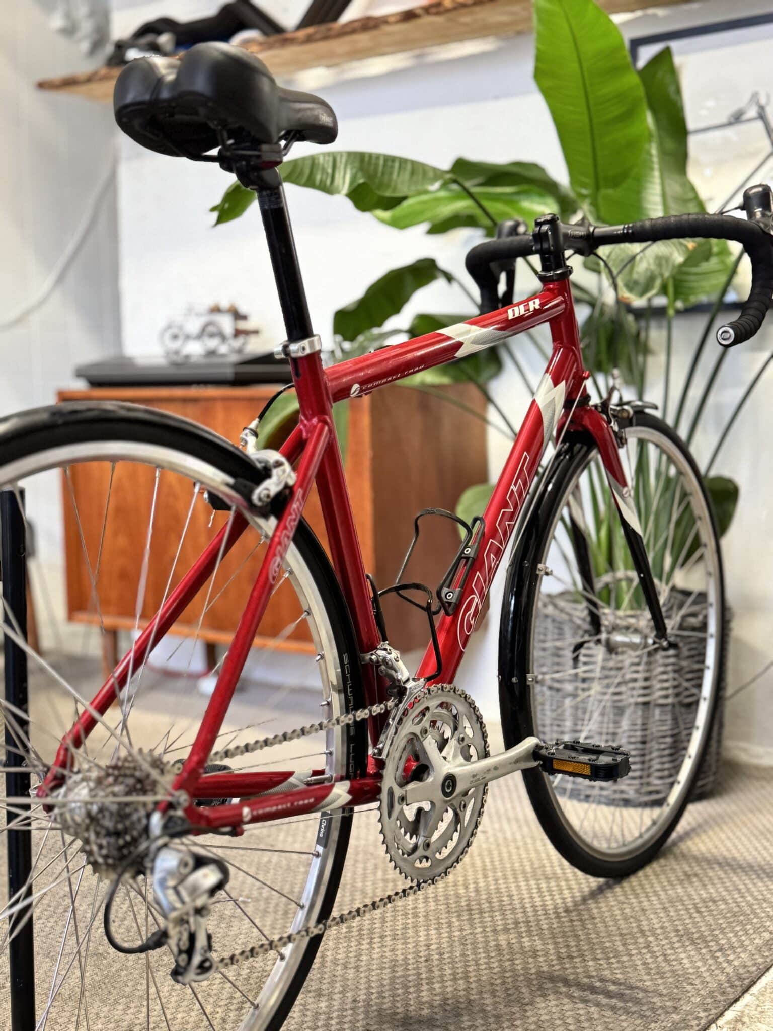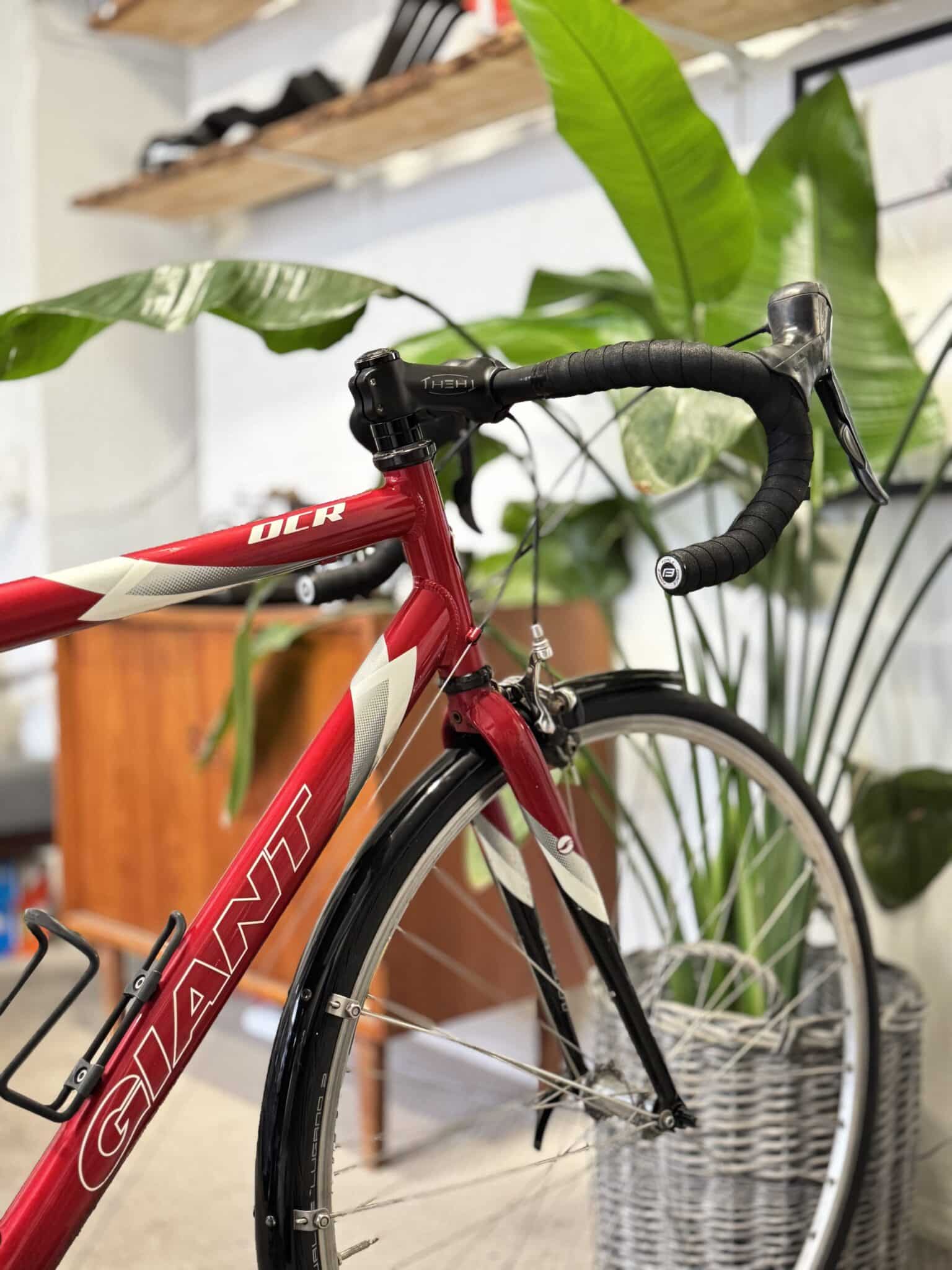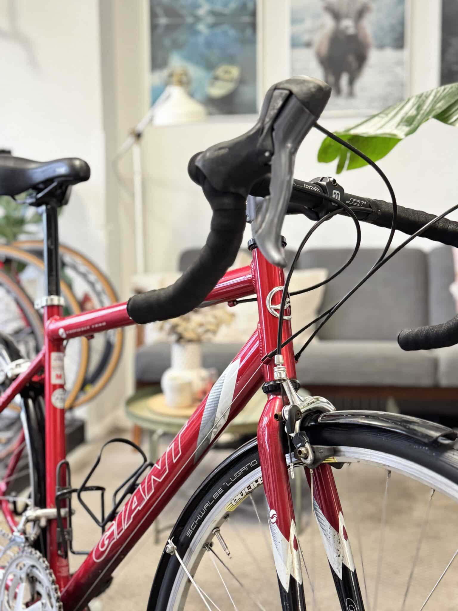 Her står en superstabil aluminium-racer fra velrenommerede Giant, udstyret med 27 velfungerende gear, friske racerdæk og en ramme, der er både pæn, velholdt og lækkert lakeret i en dyb rød farve. En cykel, der bare spiller fra første tråd.