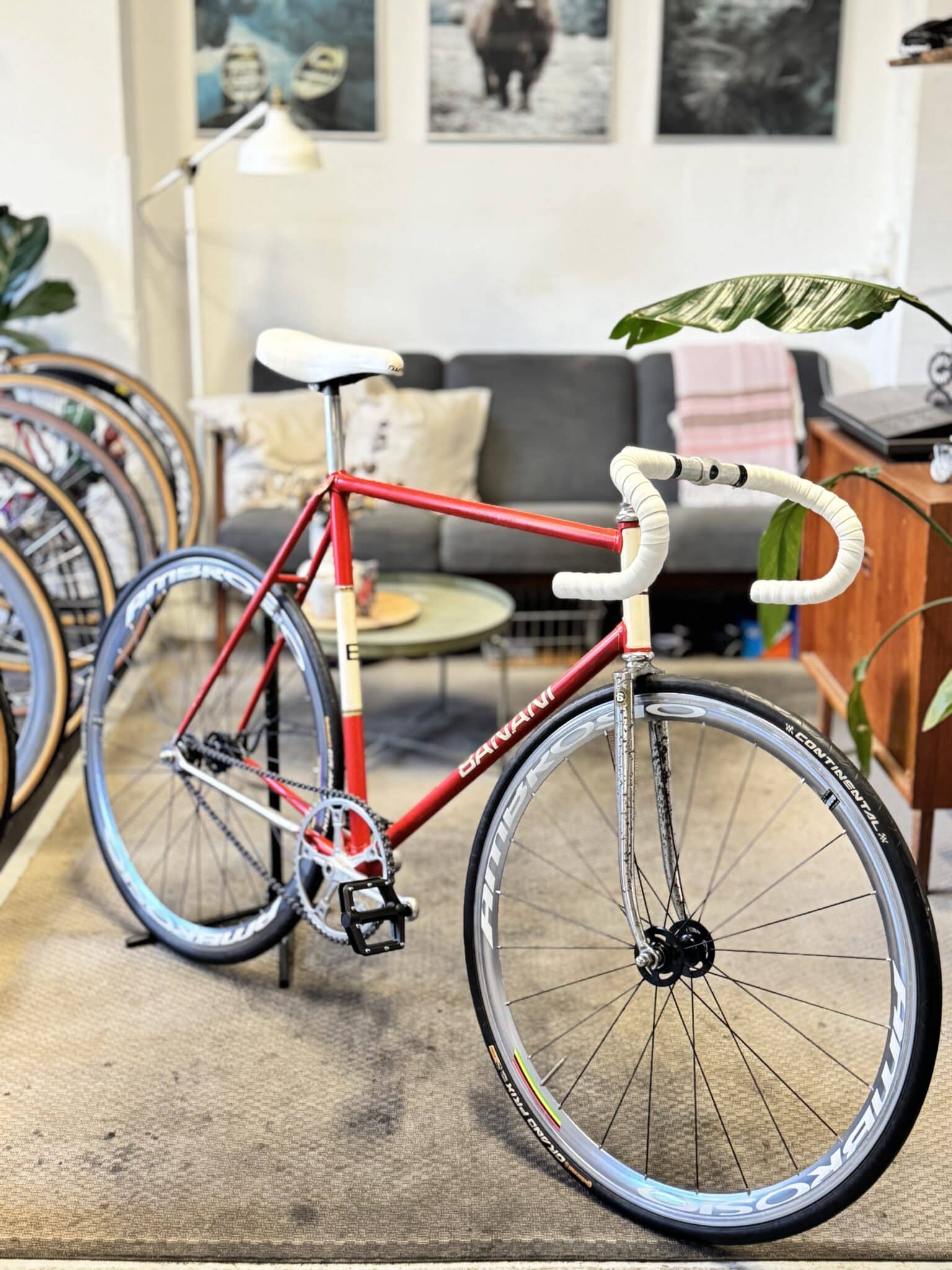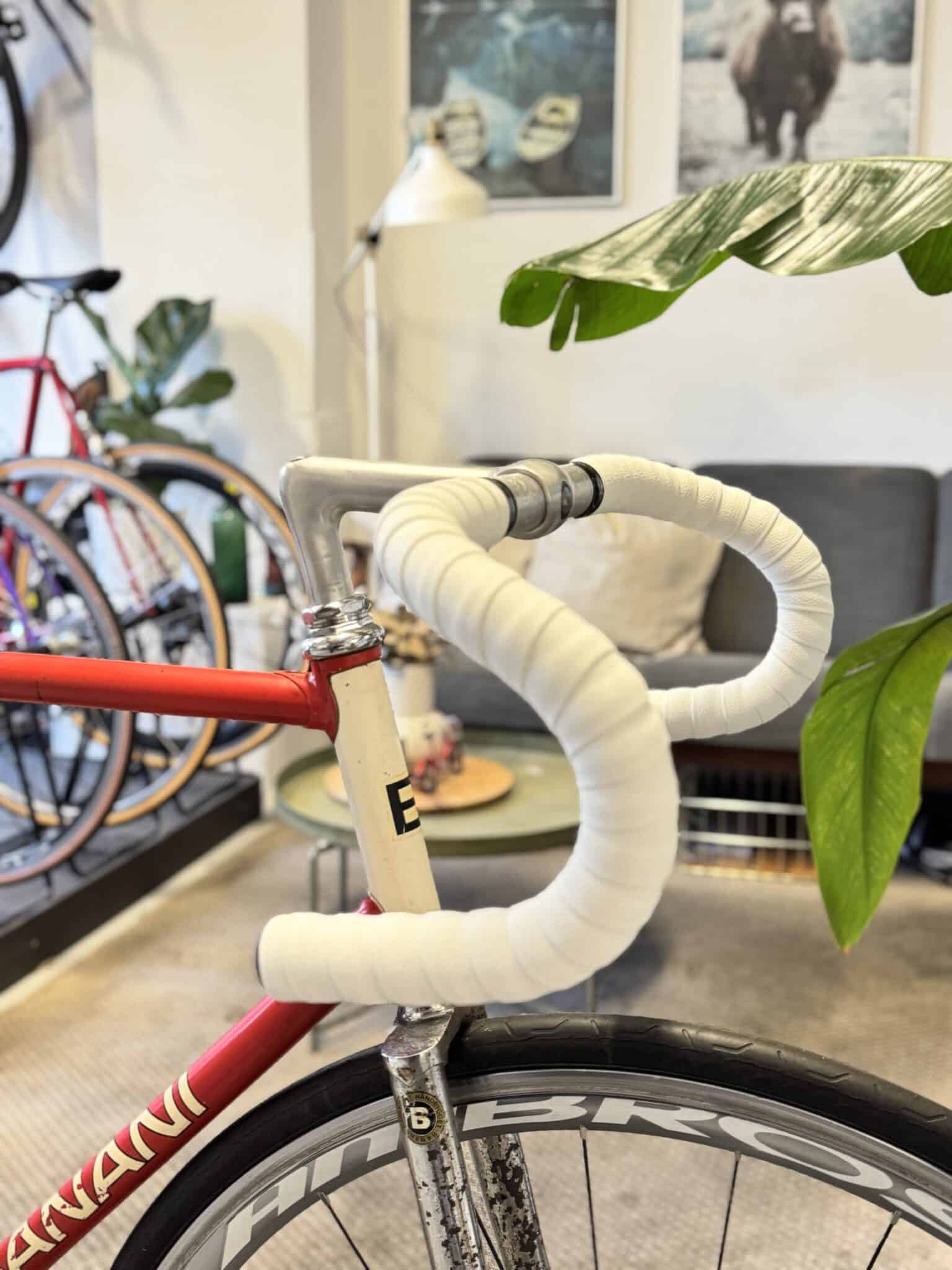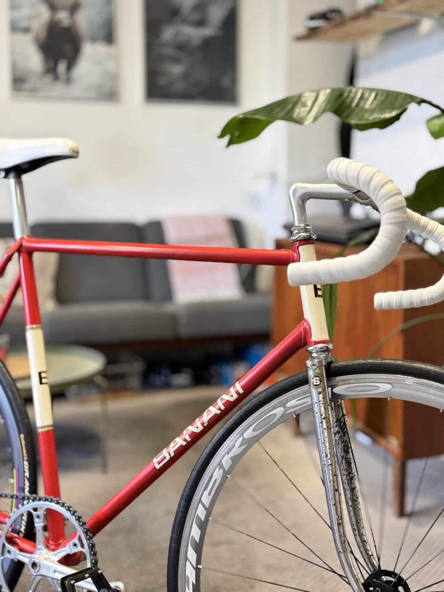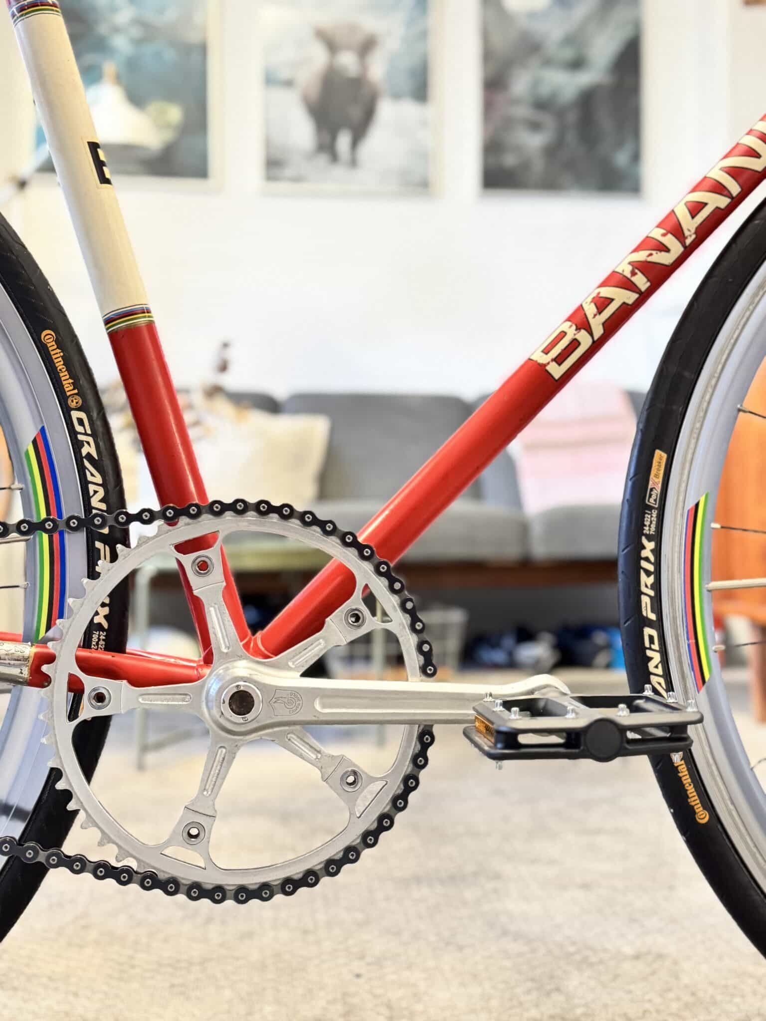 Den ikoniske Banani-ramme står med den helt rigtige patina og karakter, og vi har givet den en brutal opsætning med tung gearing, hurtigt hjulsæt og alle de originale Campagnolo og Cinelli dele intakte – præcis som dengang, den rullede ud fra værkstedet første gang.