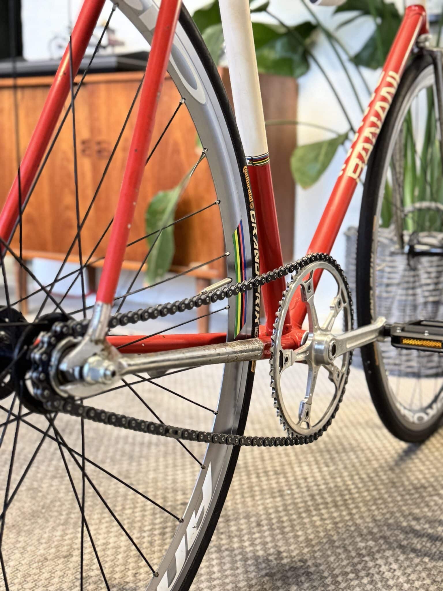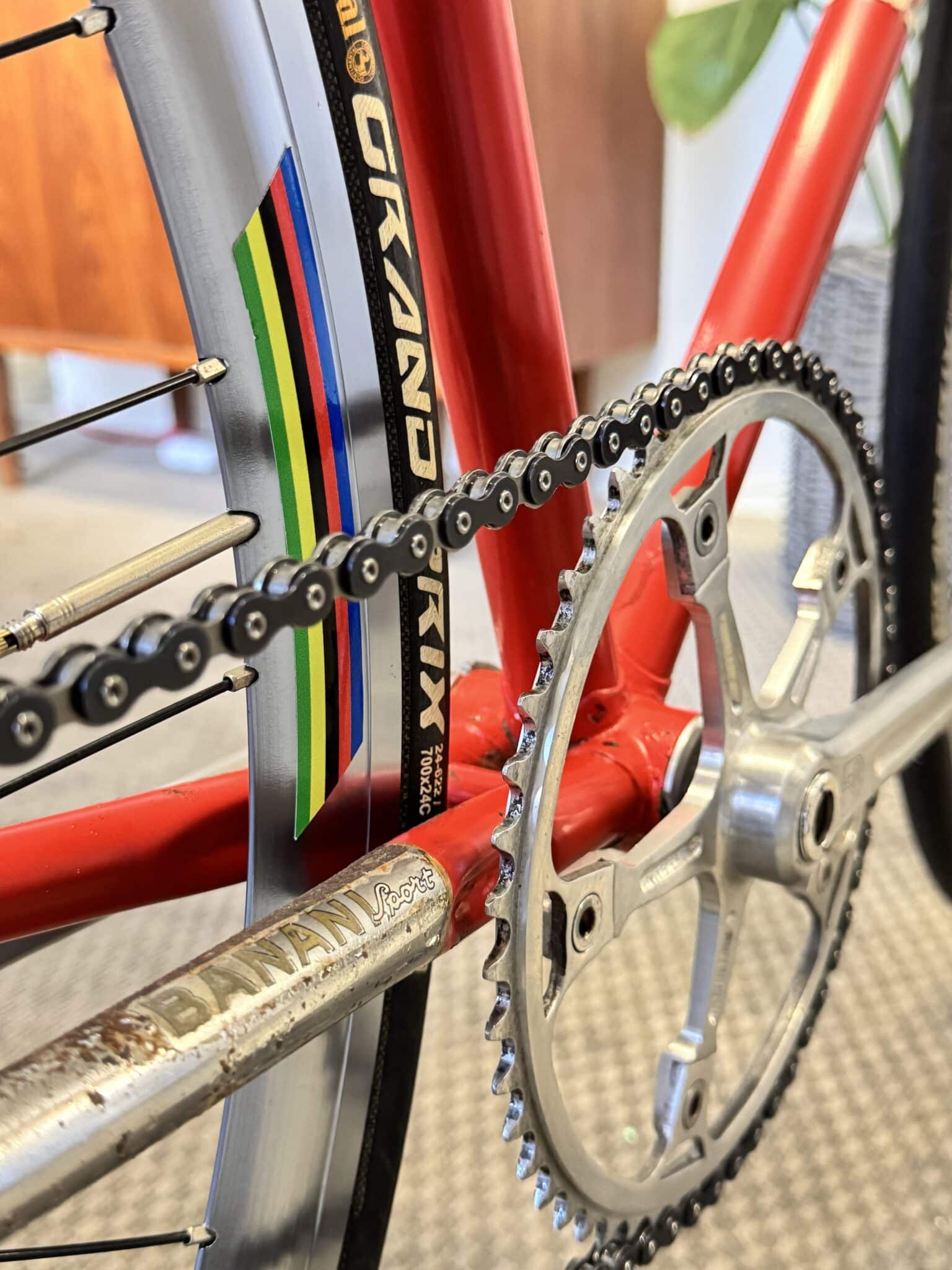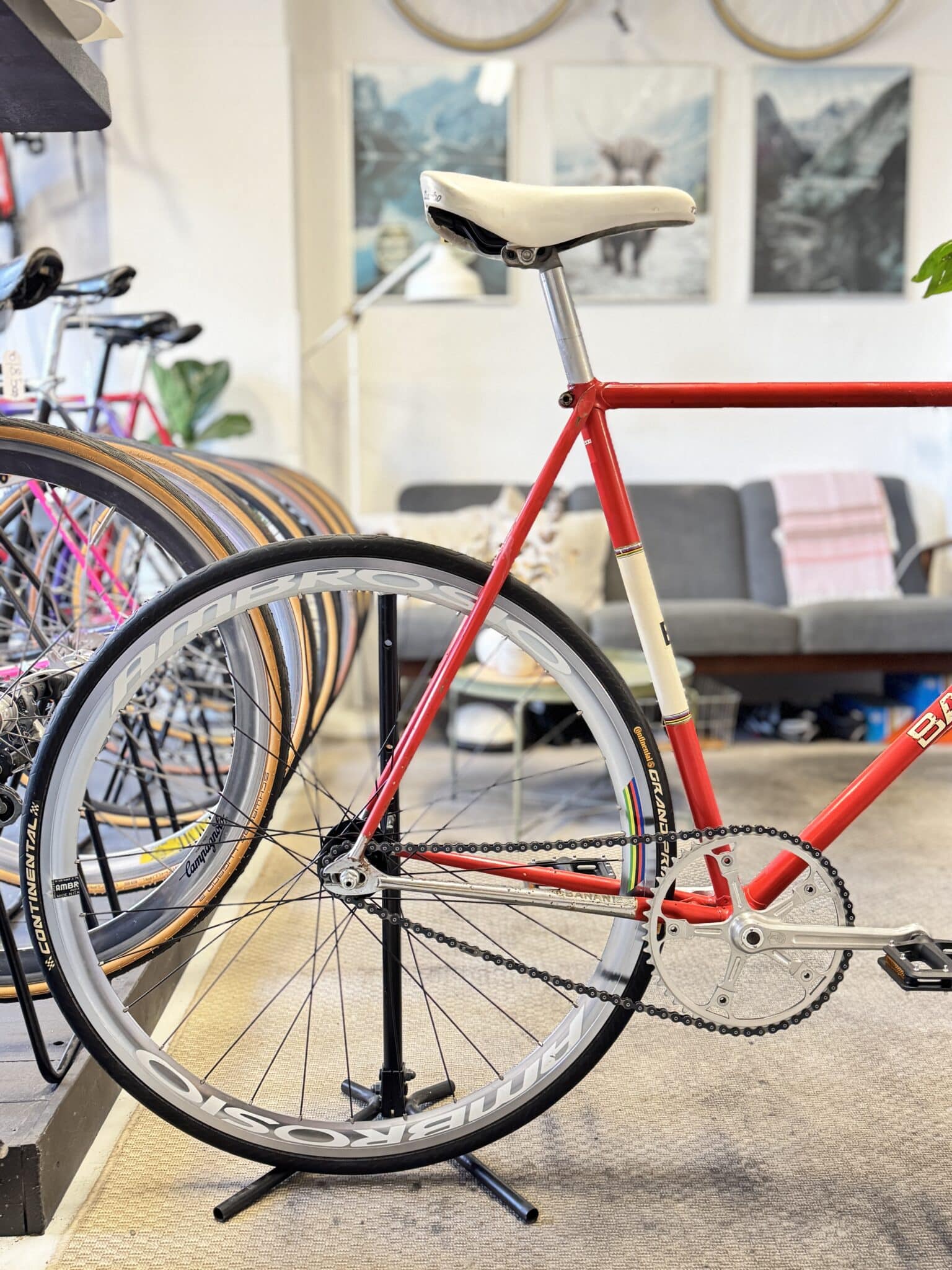 Den ikoniske Banani-ramme står med den helt rigtige patina og karakter, og vi har givet den en brutal opsætning med tung gearing, hurtigt hjulsæt og alle de originale Campagnolo og Cinelli dele intakte – præcis som dengang, den rullede ud fra værkstedet første gang.