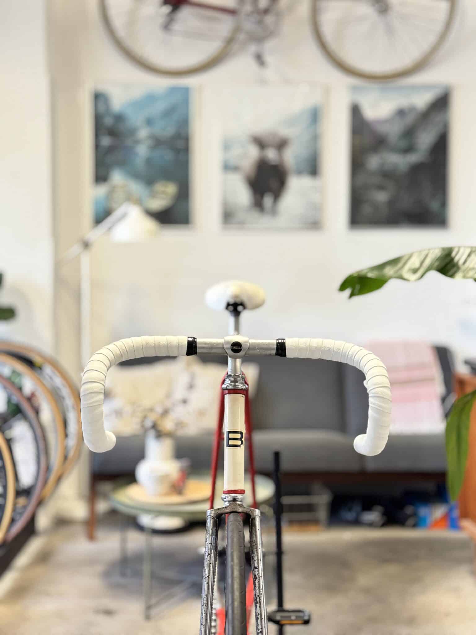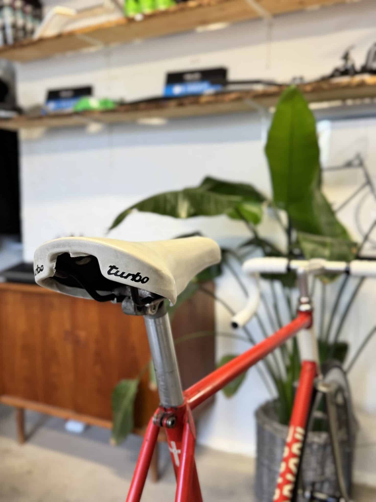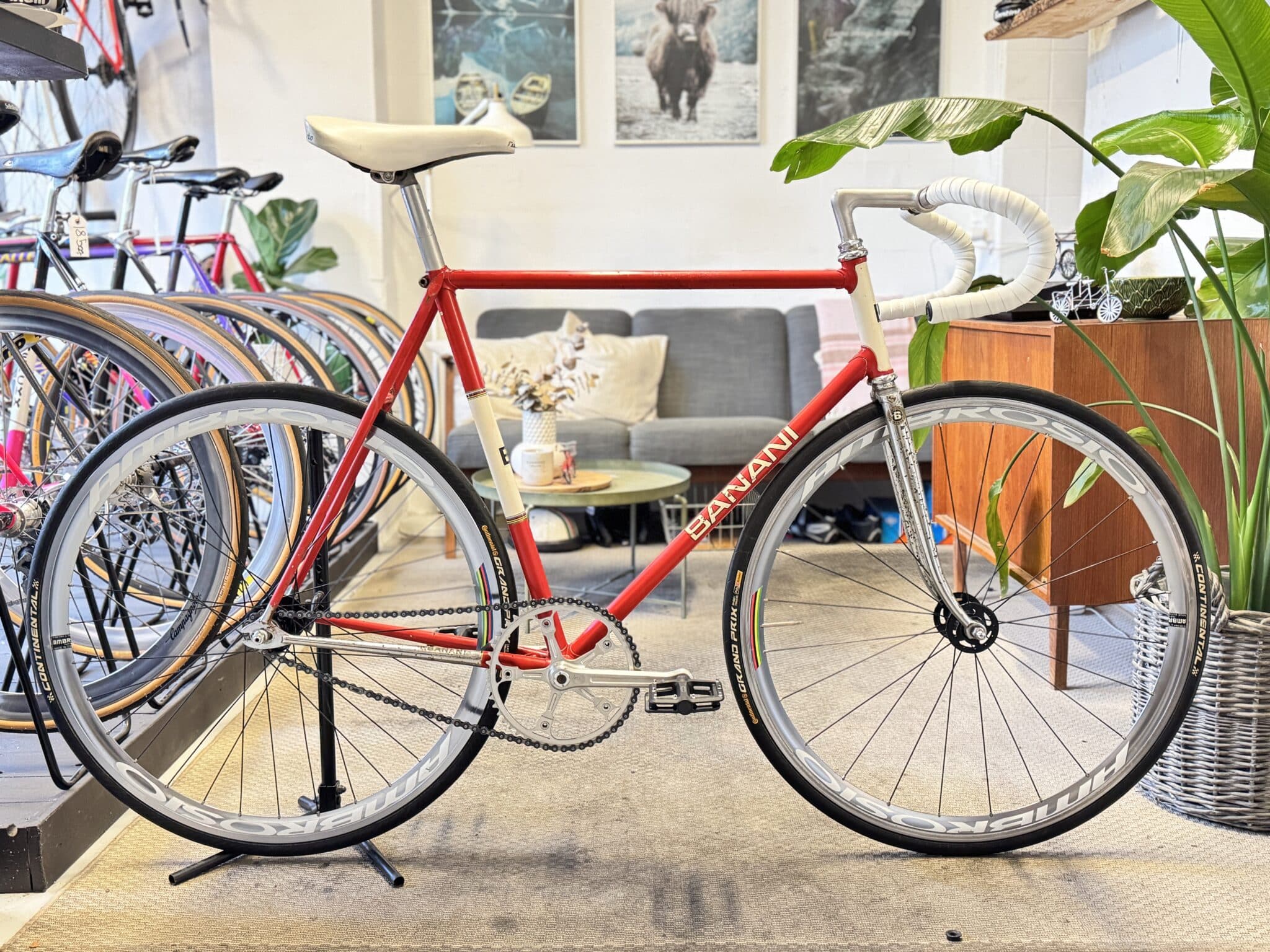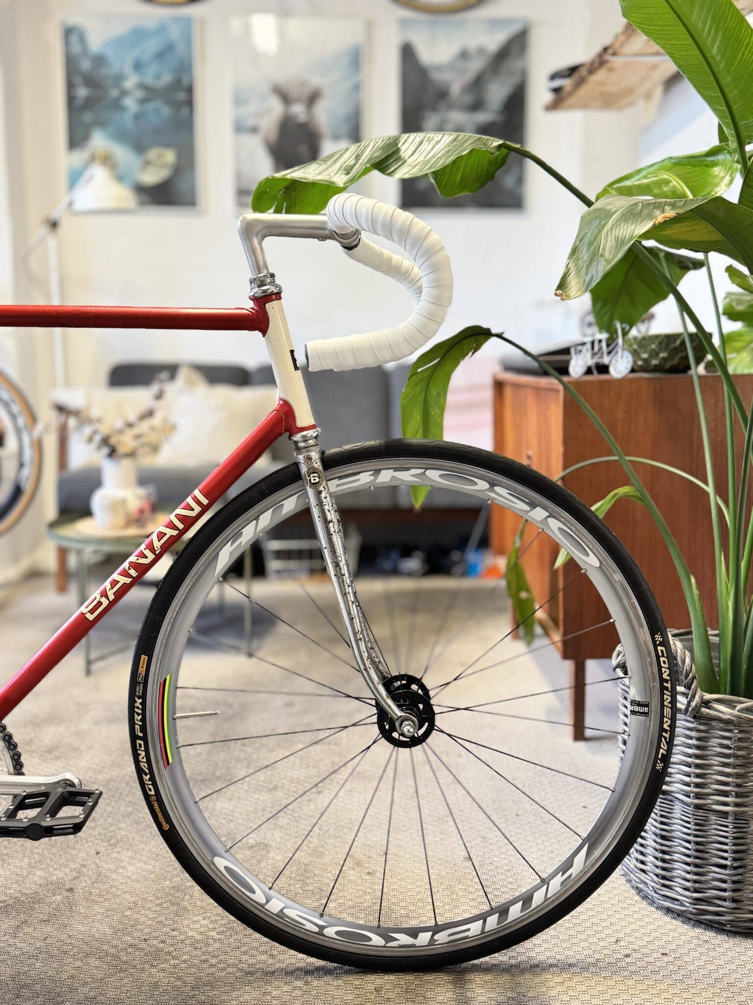 Den ikoniske Banani-ramme står med den helt rigtige patina og karakter, og vi har givet den en brutal opsætning med tung gearing, hurtigt hjulsæt og alle de originale Campagnolo og Cinelli dele intakte – præcis som dengang, den rullede ud fra værkstedet første gang.