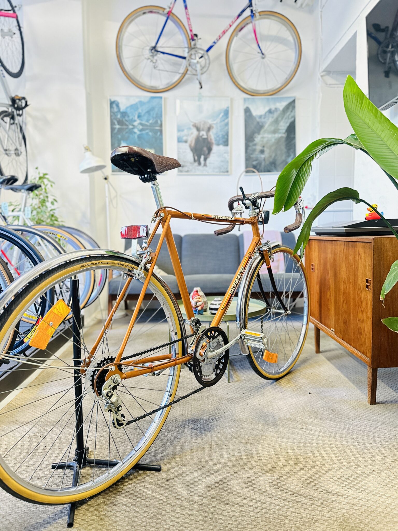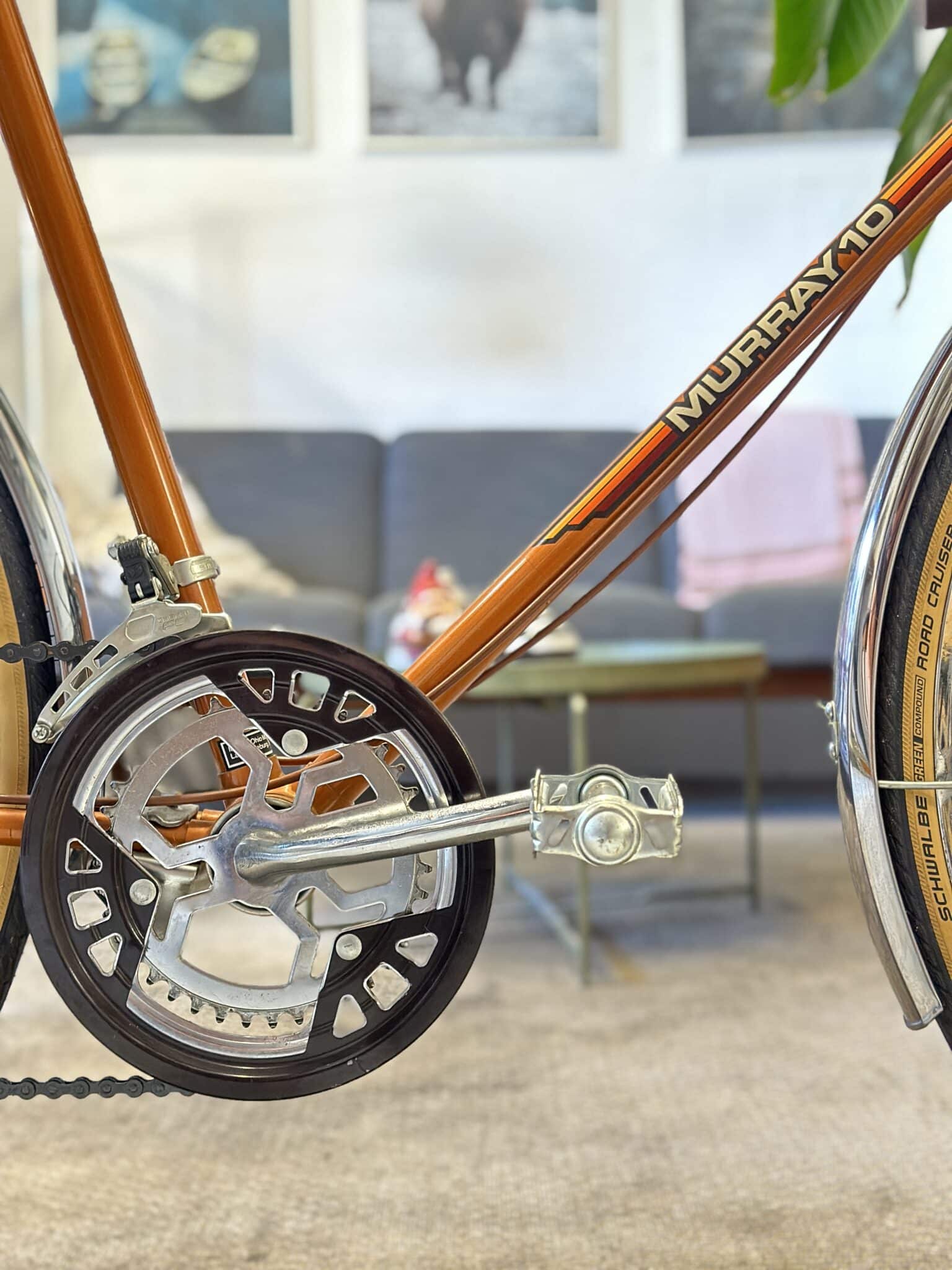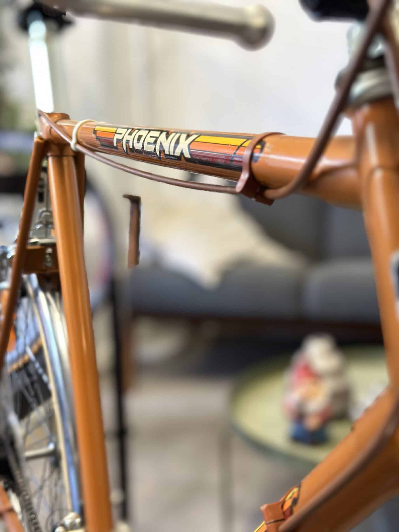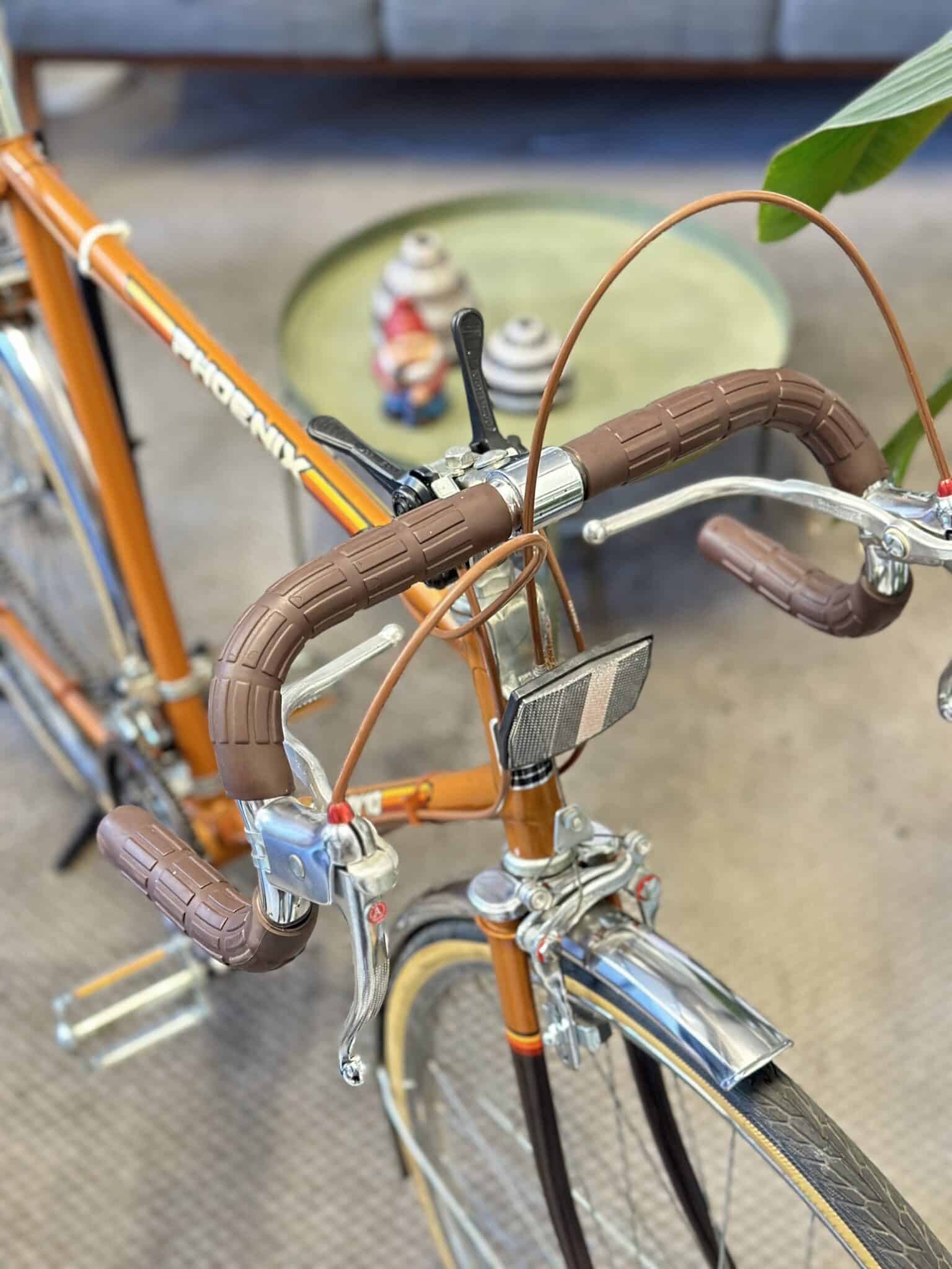Phoenix Murray 10 er en smuk vintage racercykel fra 1980’erne, der fremstår i perfekt stand uden en eneste ridse. Cyklen er ikke bare en fryd for øjet med sin flotte metalliske orange/brune farve, men også en fantastisk repræsentant for Phoenix-mærkets kvalitet og håndværk. Alt på cyklen er originalt, hvilket gør den til en sjælden perle for samlere og cykelentusiaster.