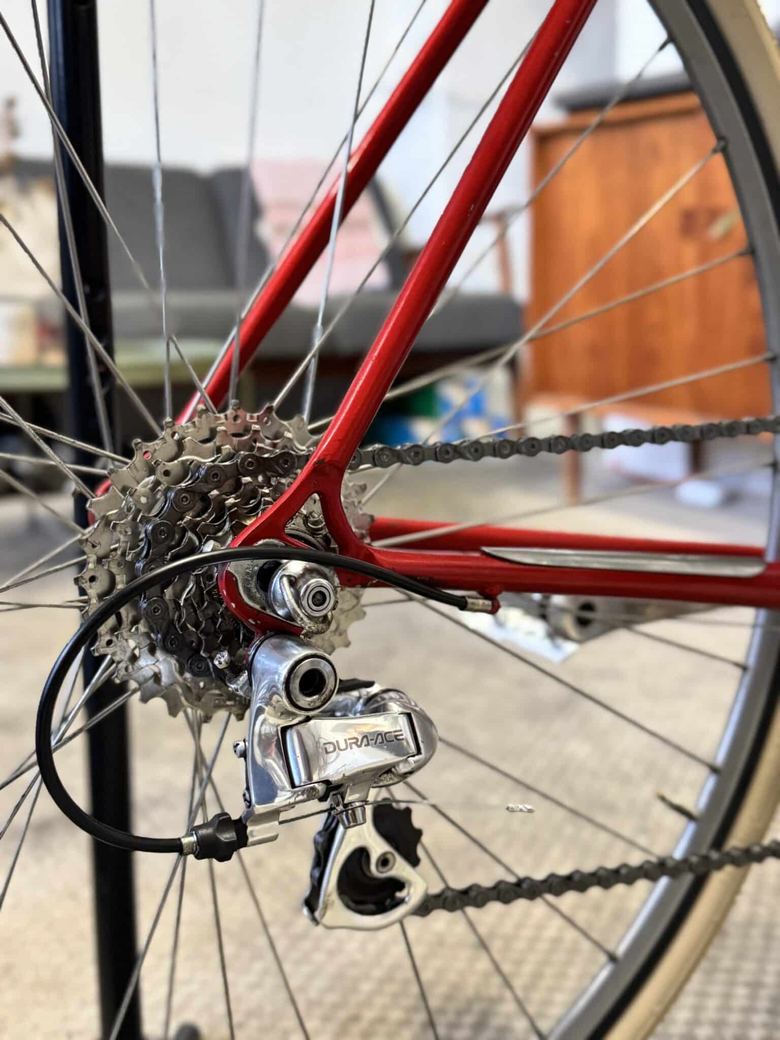 Looket spiller max – og det samme gør komponentlisten. Cyklen er udstyret med en komplet Shimano Dura-Ace 7700-gruppe inkl. bremser, og som prikken over i’et er hjulsættet naturligvis også Dura-Ace. Resultatet? En cykel der kører som en drøm og ser knivskarp ud, både i bevægelse og stilstand.