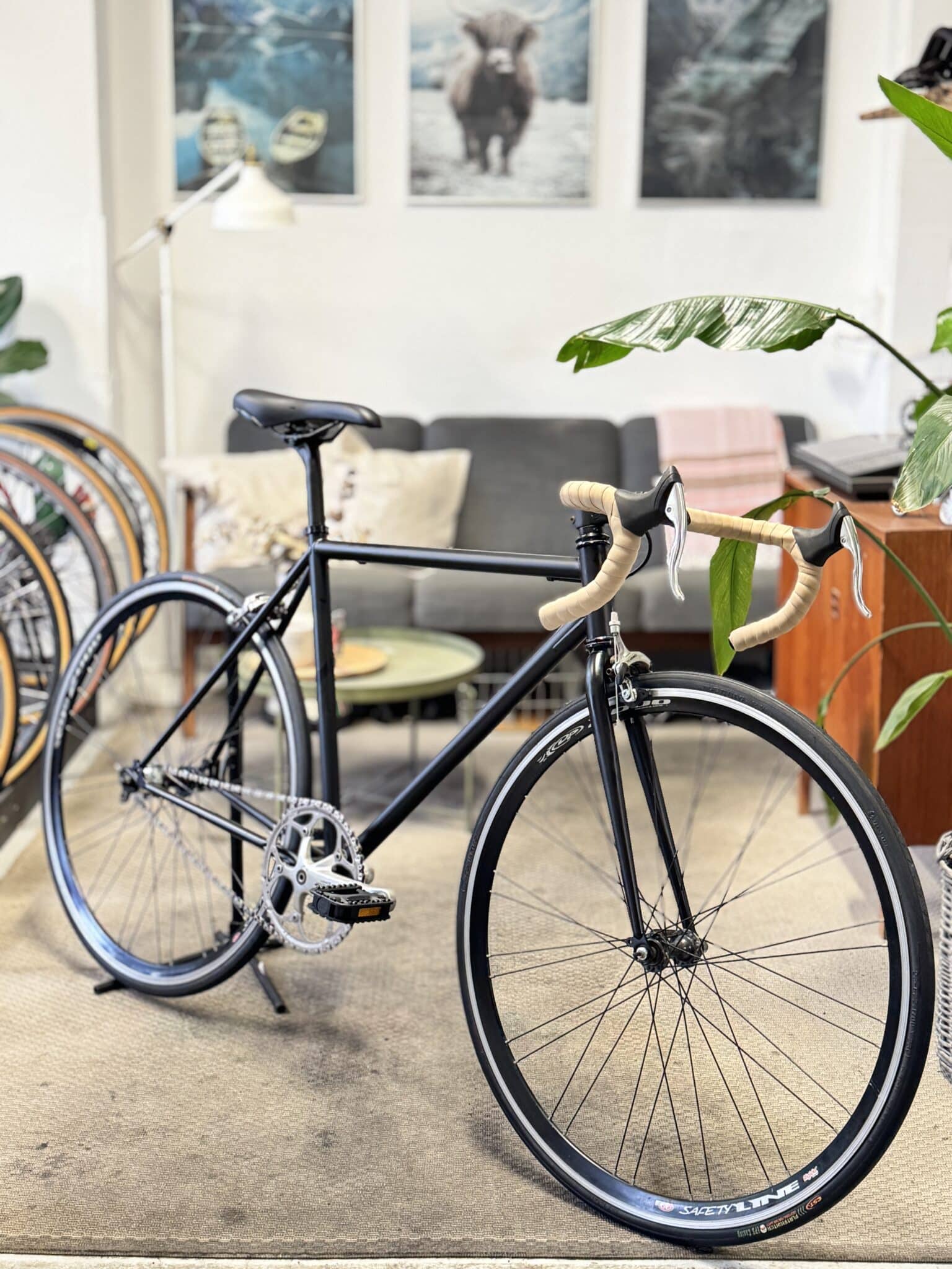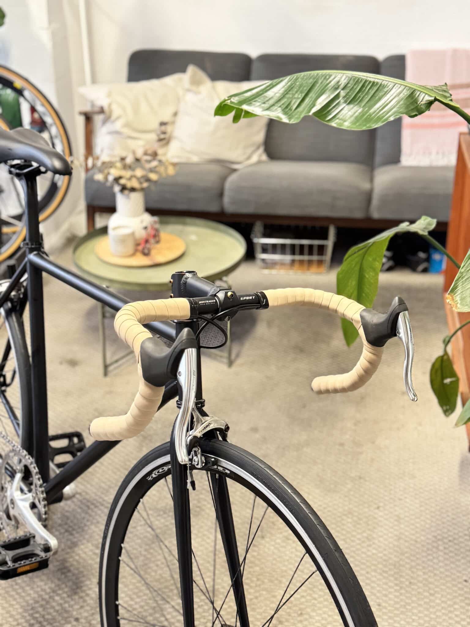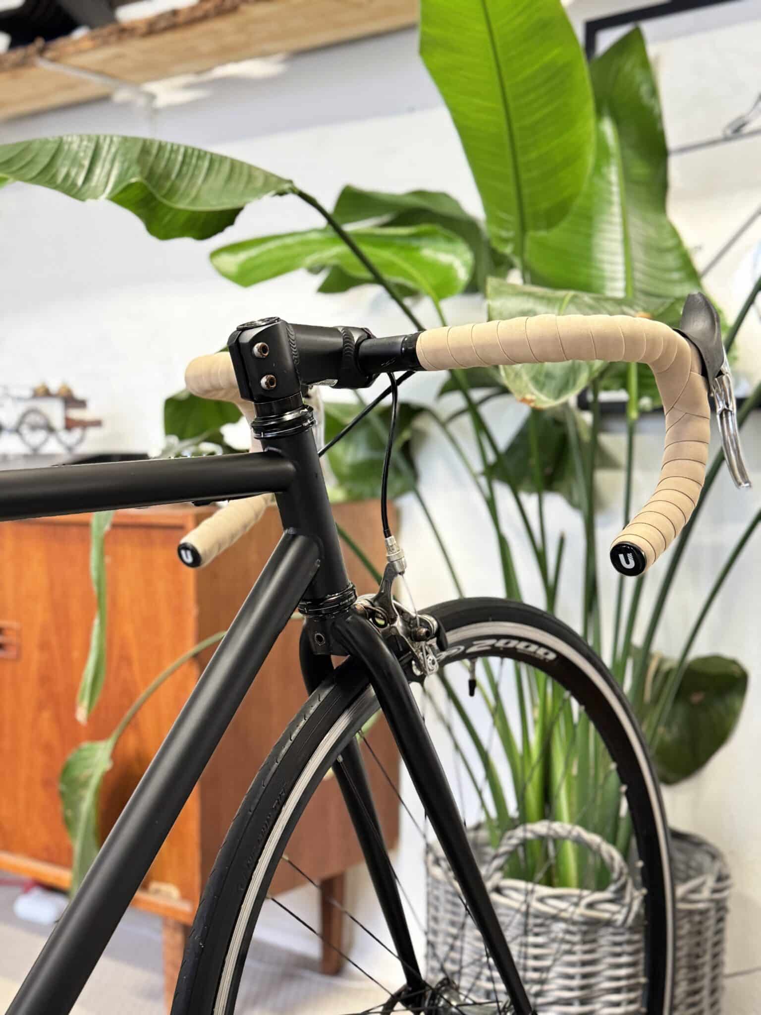 Vi har bygget den op på en spritny second hand ramme i matsort – uden ridser, mærker eller logoer. Resultatet? En fuldstændig clean cykel, hvor kun det smukke beige styrbånd bryder det sorte look og giver den lidt kant og karakter.