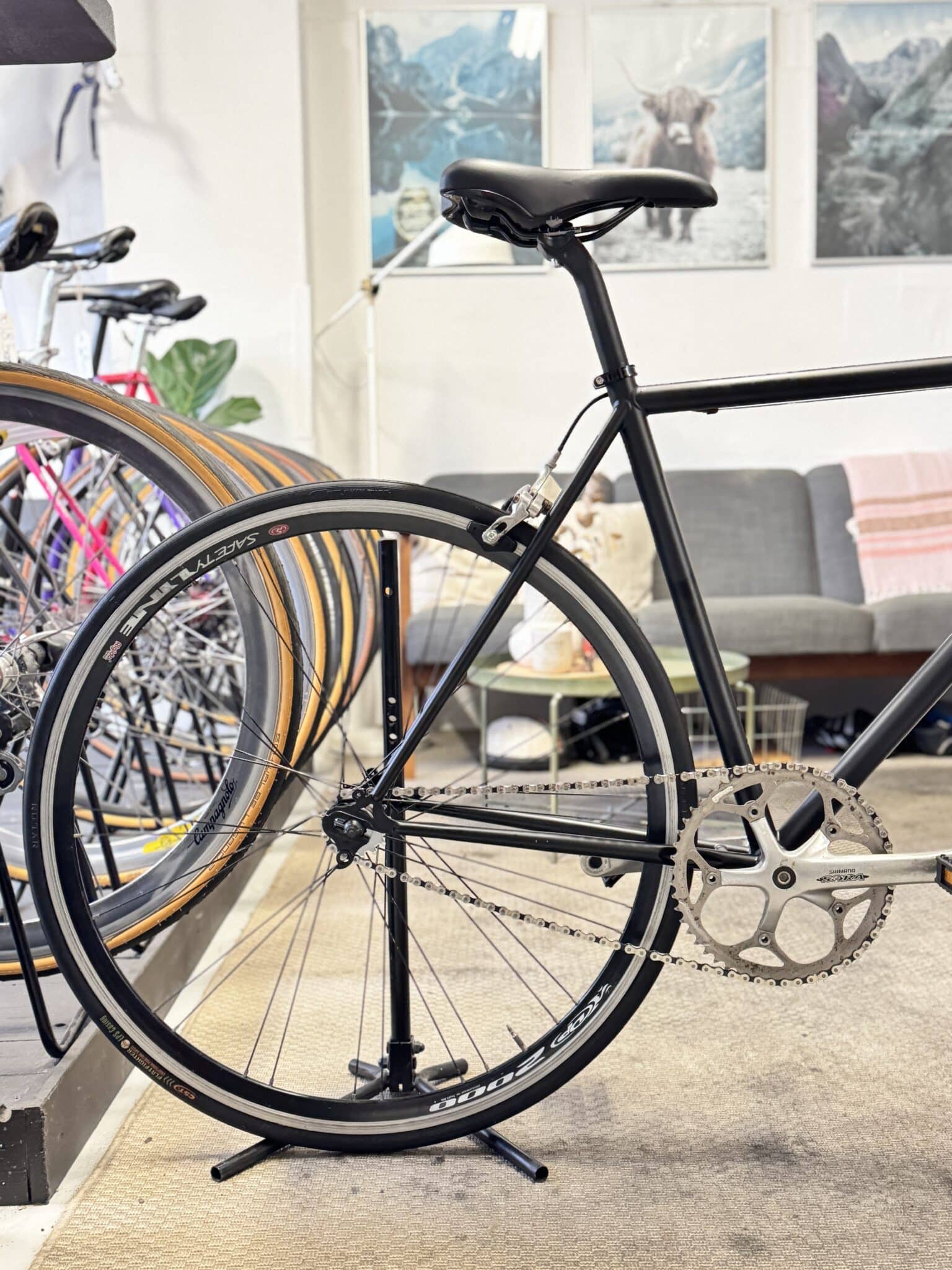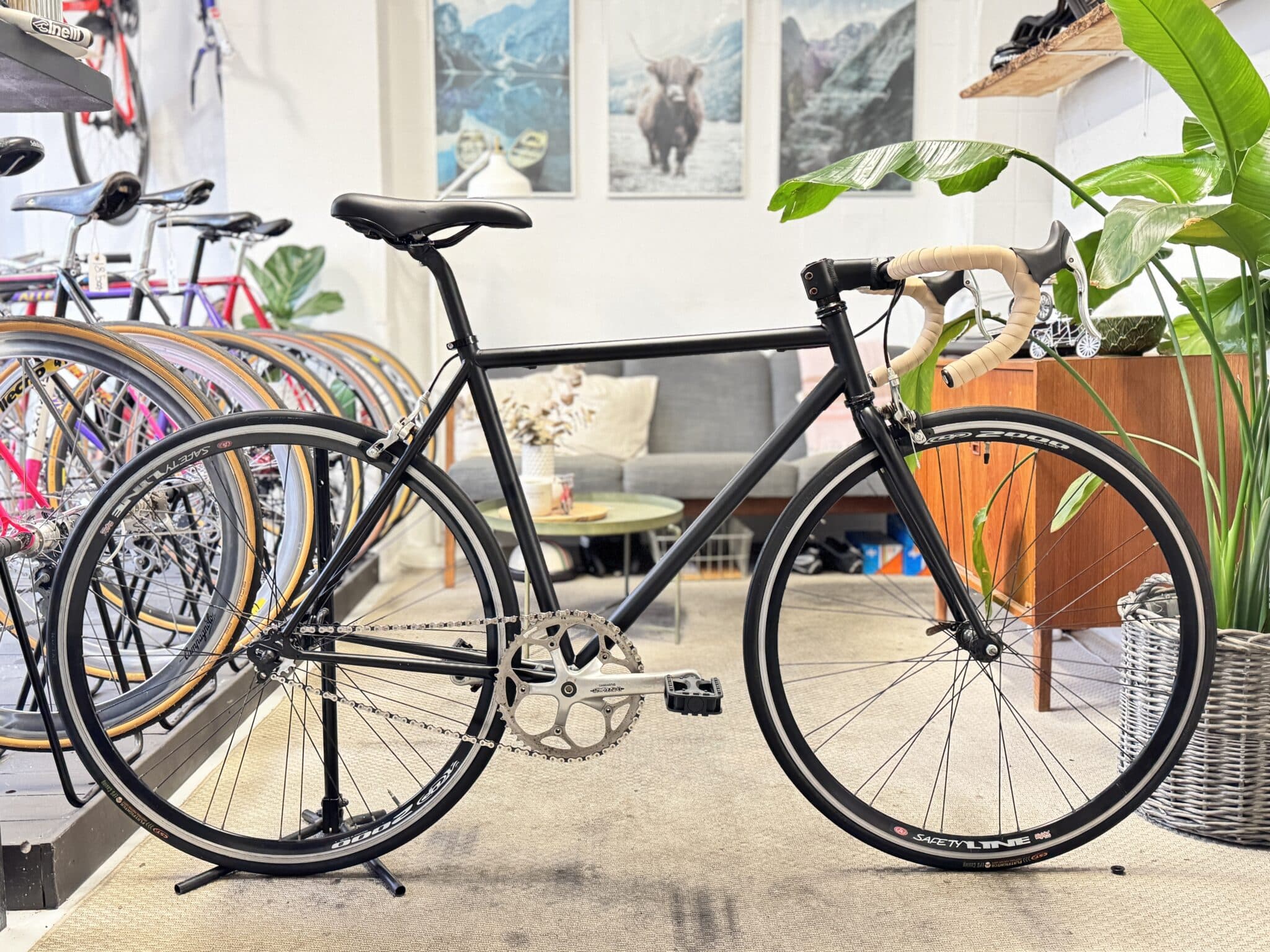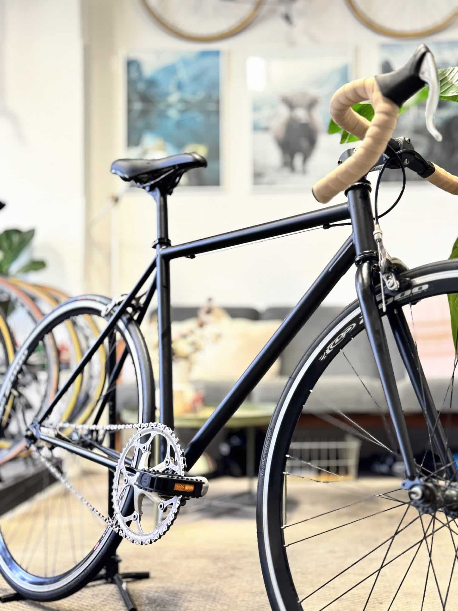 Vi har bygget den op på en spritny second hand ramme i matsort – uden ridser, mærker eller logoer. Resultatet? En fuldstændig clean cykel, hvor kun det smukke beige styrbånd bryder det sorte look og giver den lidt kant og karakter.
